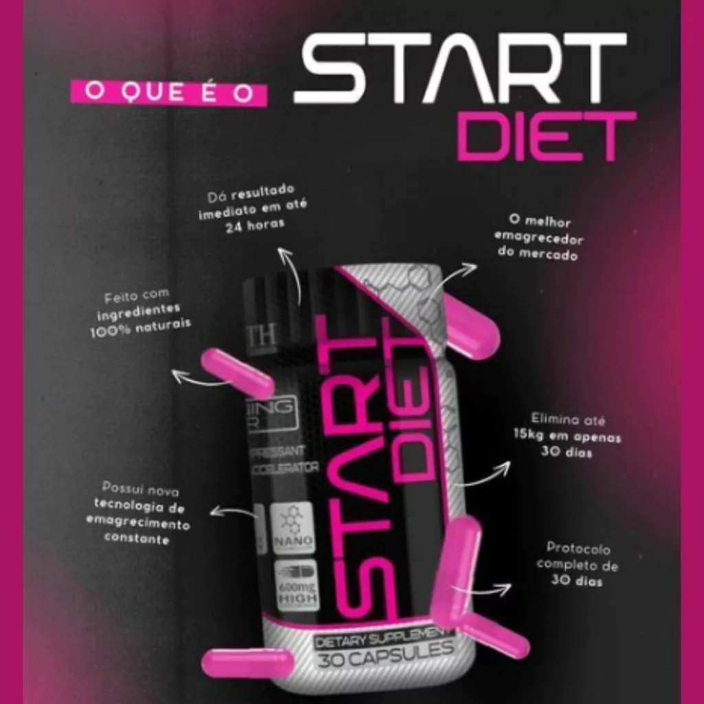 O Start Diet é um emagracedor composto por ingredientes naturais que tem a função de acelerar o metabolismo, queimar gordura, reduzir o apetite, elimina até 15kg em 30 dias.